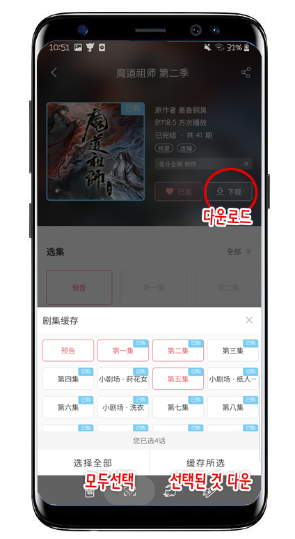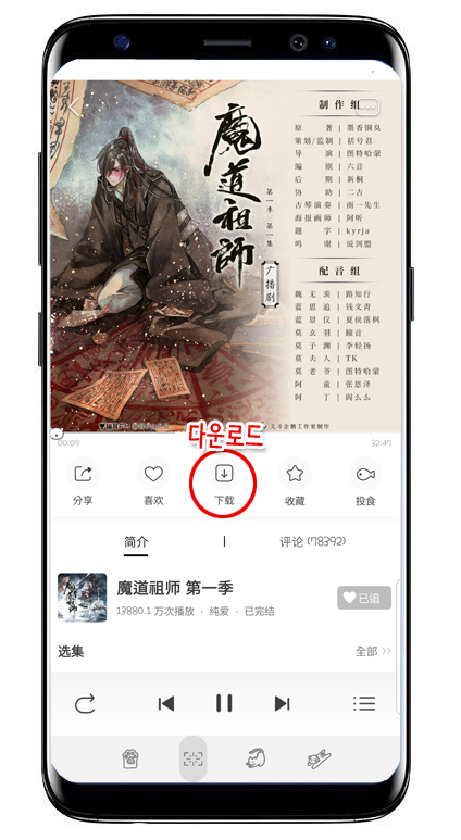 - 어플 들어가서 듣고 있는 회차 일러스트 밑에 있는 下载(다운로드) 클릭.