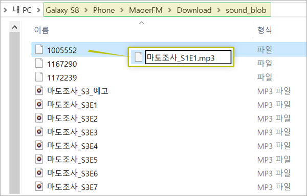 다운받은 파일은 '핸드폰' 내장메모리 > MaoerFM > Download > sound_blob 에 저장되어 있다.