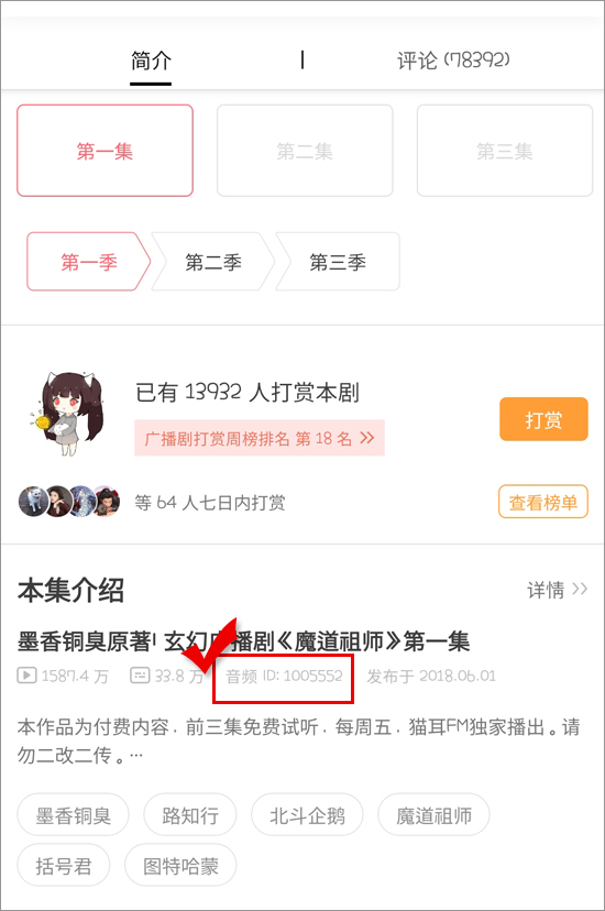 숫자로만 된 파일명이 나와서 당황스러운데,, 각 회차마다 위의 이미지처럼 音频(오디오) ID 가 있기 때문에 여기 적힌 숫자를 보고 파일명을 수정하면 된다.