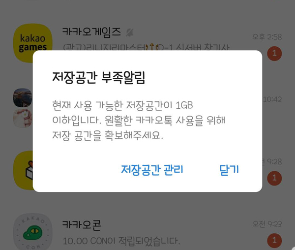 최근에 카카오톡 저장공간 부족 알림이 계속 떠서 채팅창 사진 파일을 정리해줬는데 오늘 또 경고창이 떴다.