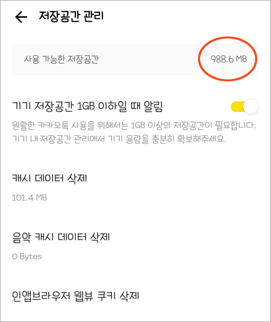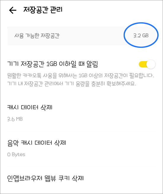 카카오톡 채팅창을 백업하고 데이터 삭제하니깐 사용 가능한 저장공간이 988MB 에서 3.2GB로 3배 이상 늘어났다.