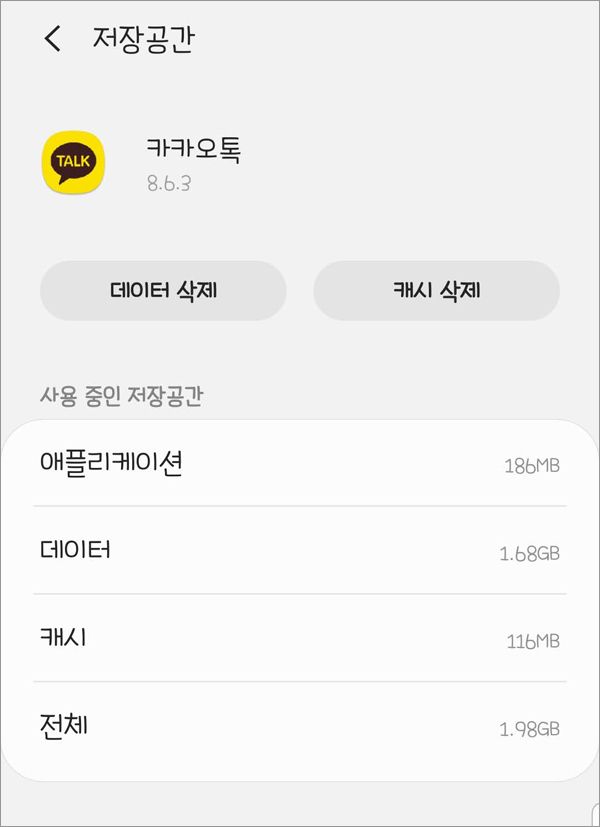 핸드폰 설정 > 애플리케이션 > 카카오톡 > 저장공간 > 데이터 삭제