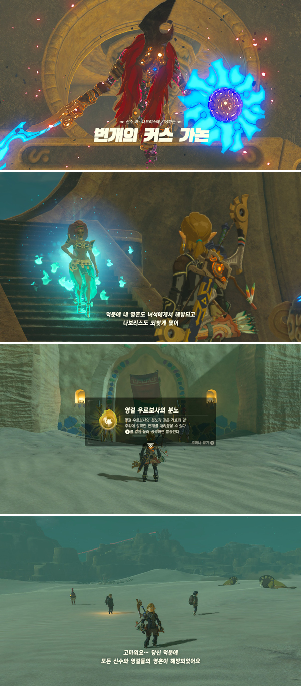 그동안 가논 한 마리씩 처치할 때마다 링크에게 잊어버린 기억을 보여줬는데, 이번에 도사를 처치하고 '영걸들의 사진'에 관한 기억을 보여준다.