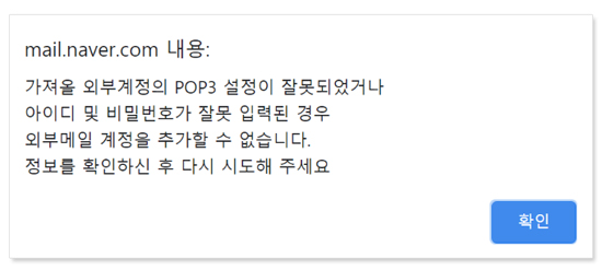 "가져올 외부 계정의 POP3 설정이 잘못되었거나 아이디 및 비밀번호가 잘못 입력된 경우 외부 메일 계정을 추가할 수 없습니다. 정보를 확인하신 후 다시 시도해 주세요."