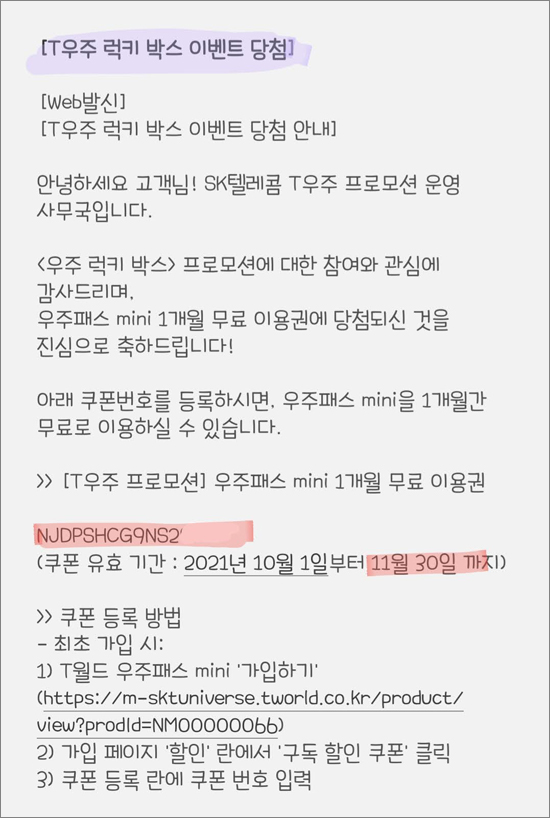 11번가 우주패스 생겼을때 두달 이용하고 이벤트로 mini 1개월 무료이용권을 받았다.