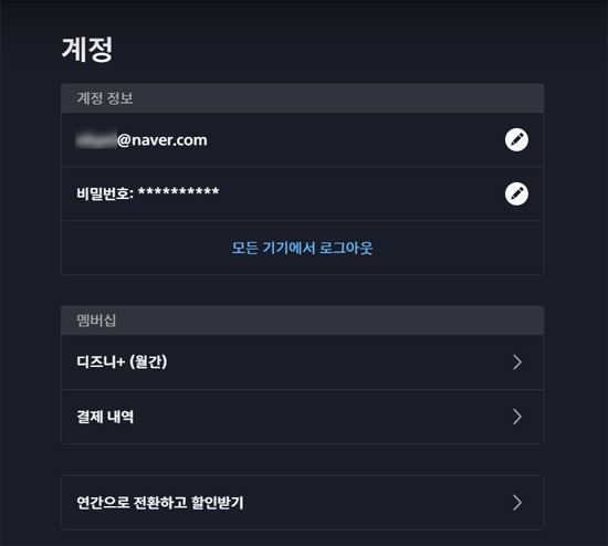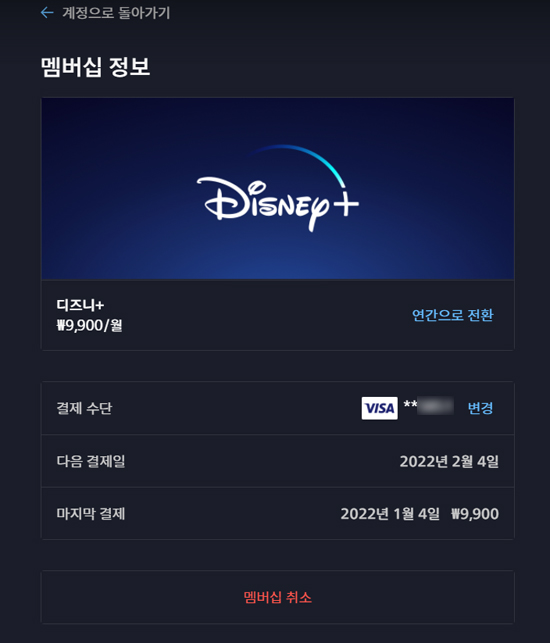디즈니 플러스 가입할때 결제수단(카드)을 등록해 놓으면 자동으로 다음달 결제일이 됐을때 멤버십이 결제된다.