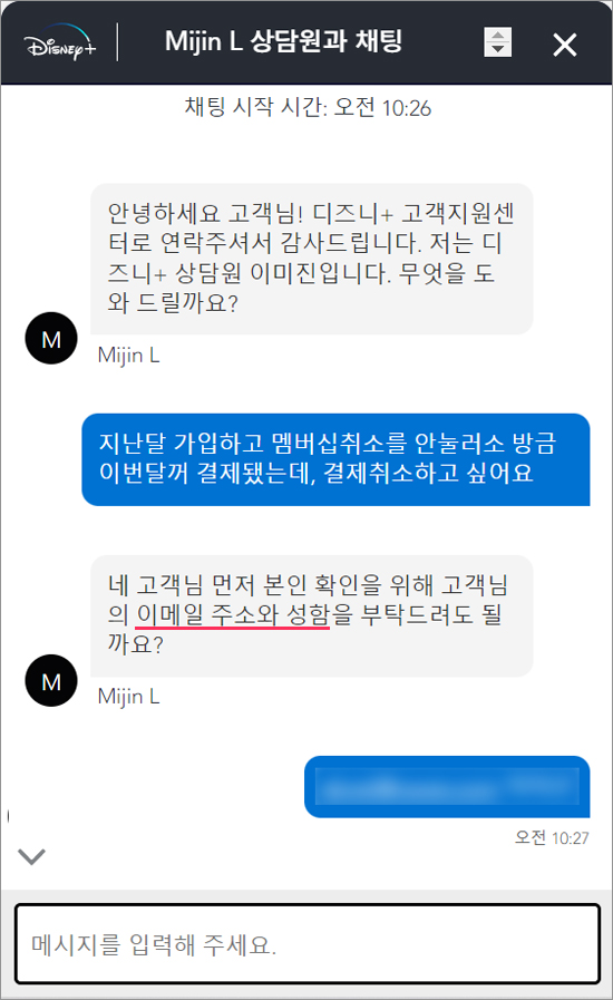디즈니 플러스 고객센터 하단에 위와 같이 <채팅 문의> <전화 문의>가 있는데, 채팅 문의로 간단하게 환불 신청 할 수 있다.