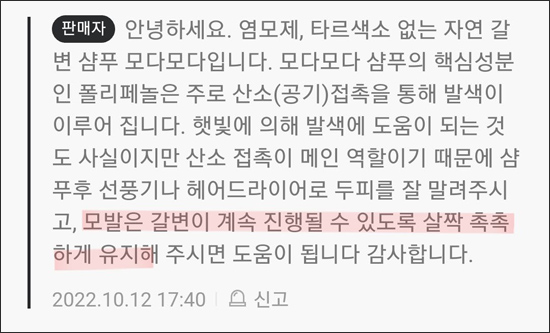 "샴푸 후 찬바람으로 두피는 꼼꼼히 모발은 살짝 촉촉한 상태를 유지하게 말려주시면 갈변에 도움이 됩니다."