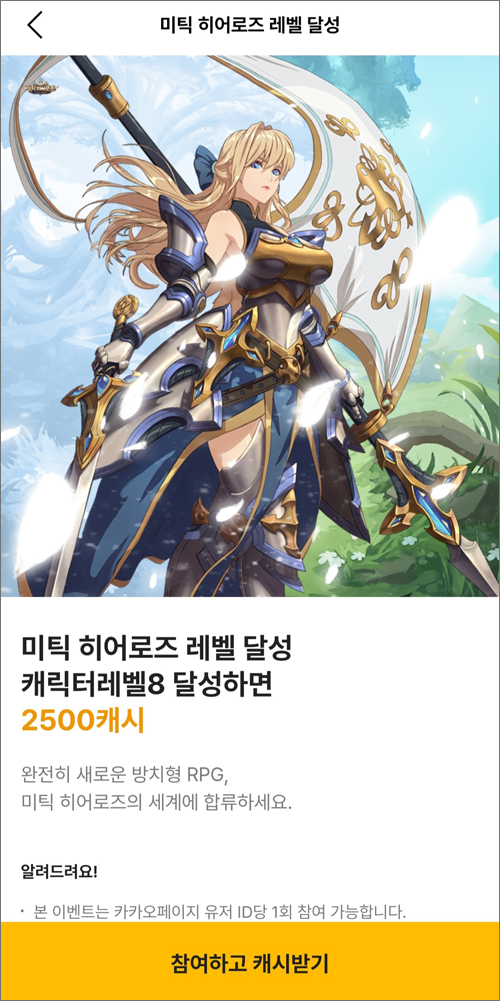캐릭터 레벨 8 달성하면 카카페 2500캐시