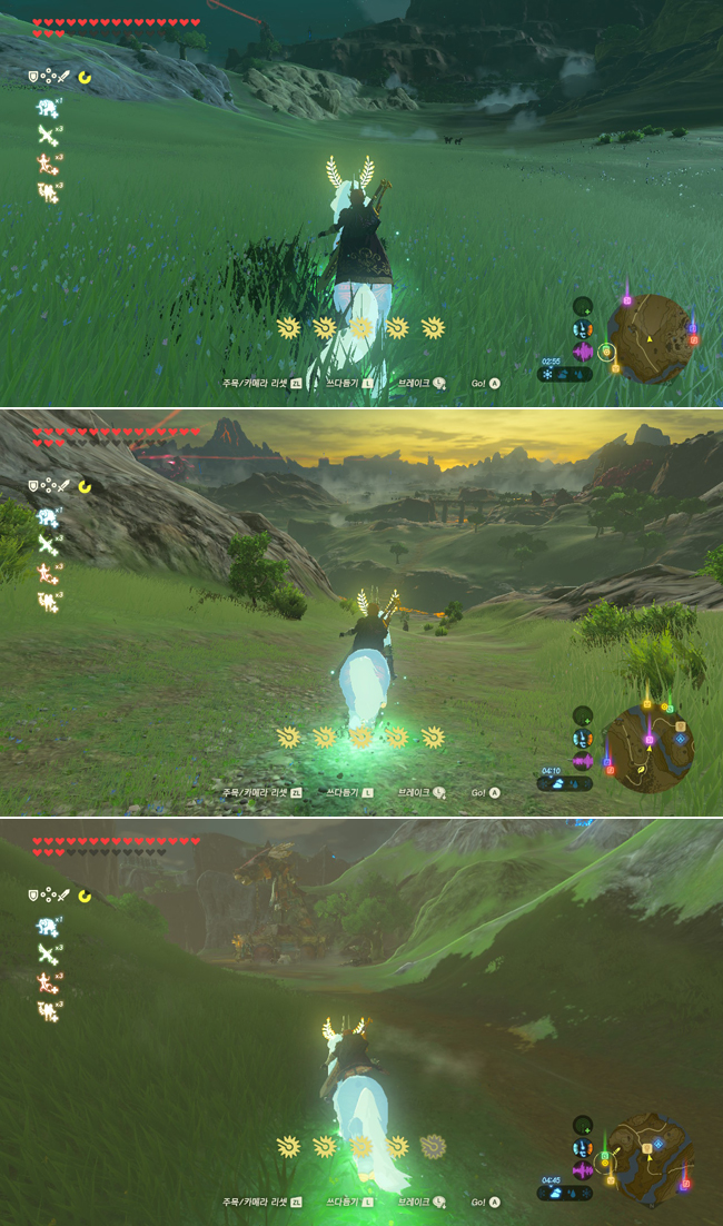 하이랄 성 근처에서 놀다가 저 멀리 빛나는 곳이 있어서 별똥별 떨어진 건가? 했는데, 사토리산 오로라였다.
