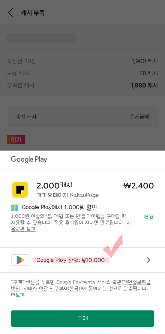 왼쪽처럼 카카페 1000캐시 1200원 충전을 누르니 자동으로 오른쪽 화면처럼 Google Play 잔액이 떠서 결제가능한 걸 알았다.