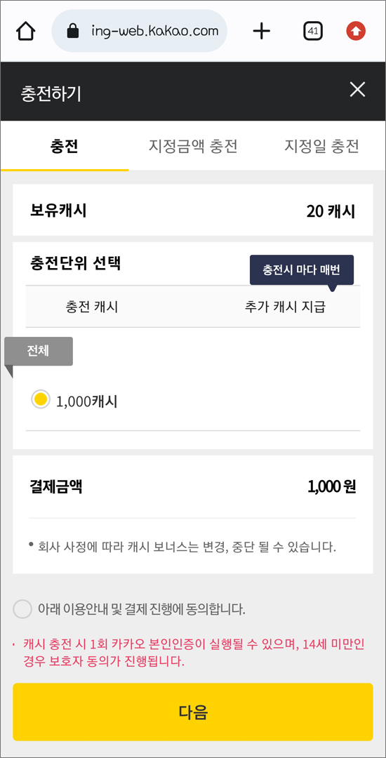 - 카카오페이지 사이트에서 결제할 경우, 1000 캐시 1000원