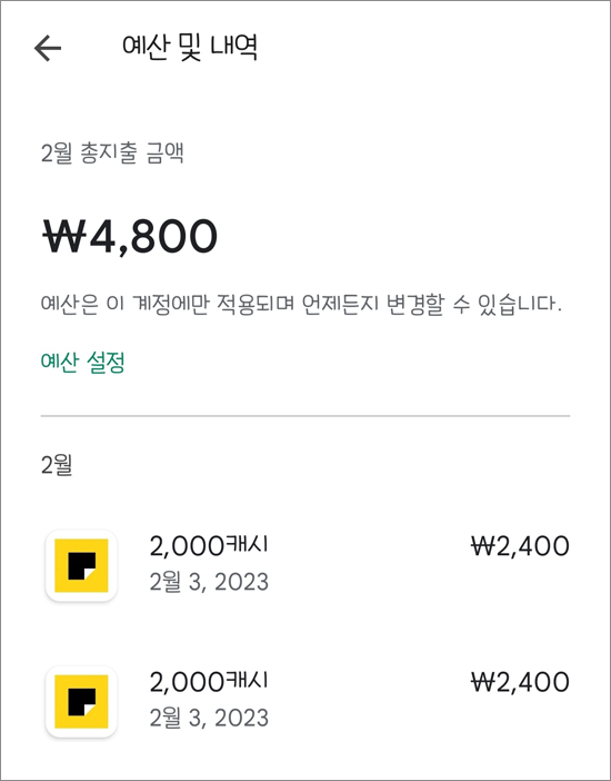 구글 플레이 > 프로필 사진 > 결제 및 정기결제 > 예산 및 내역