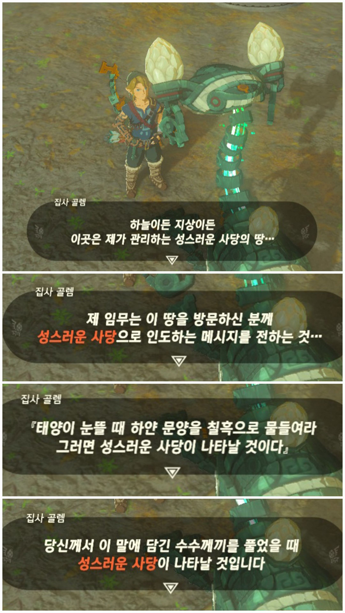 <젤다의 전설 티어스 오브 더 킹덤> 게임 내에서 집사 골렘이 '성스러운 사당'이라는 이름으로 숨겨진 사당에 대한 힌트를 준다.