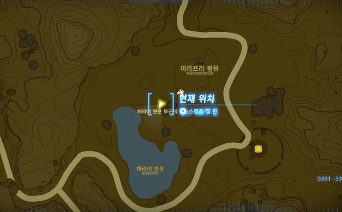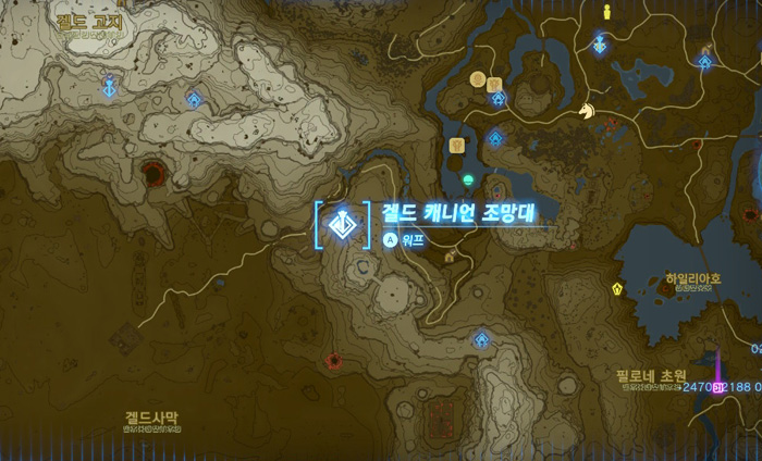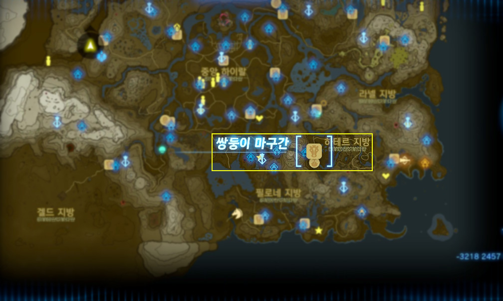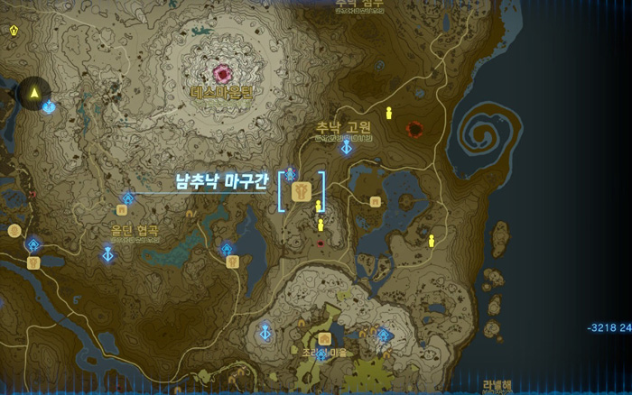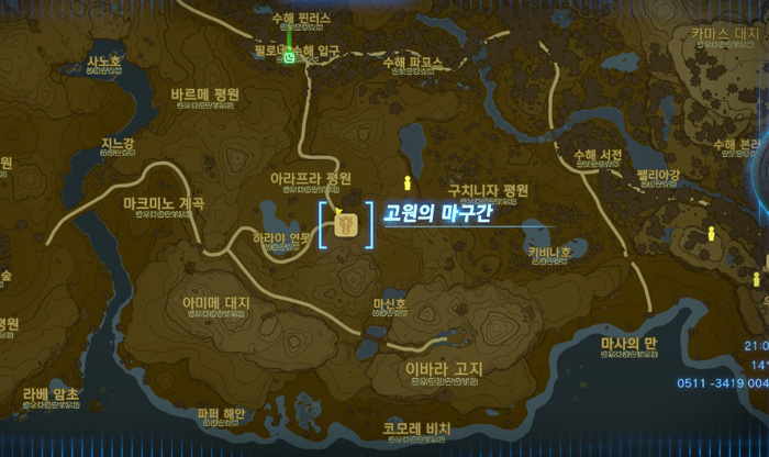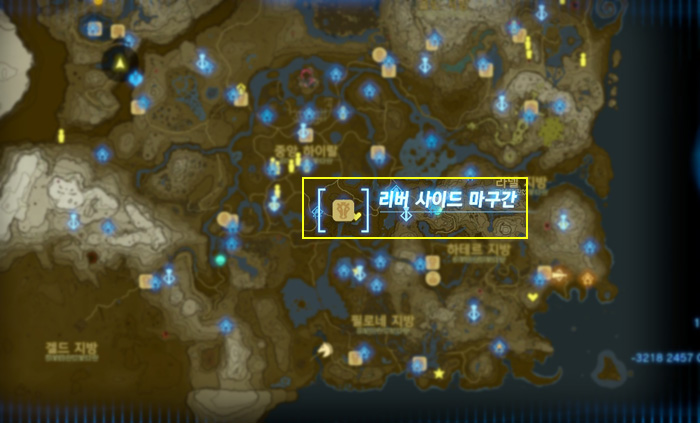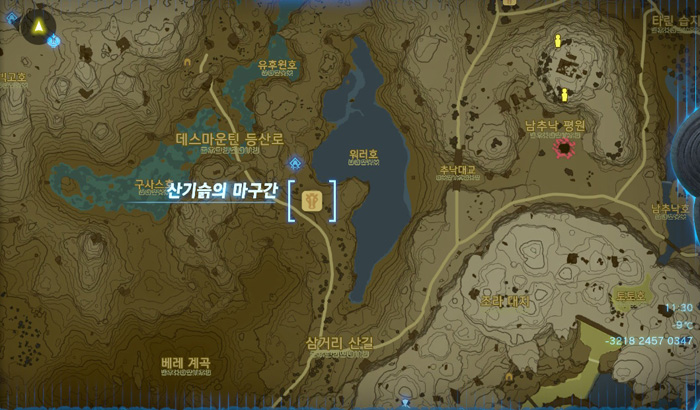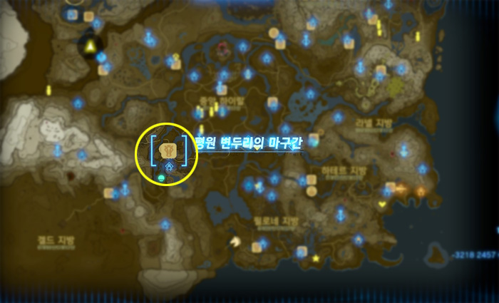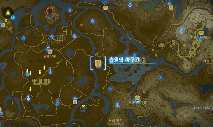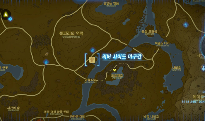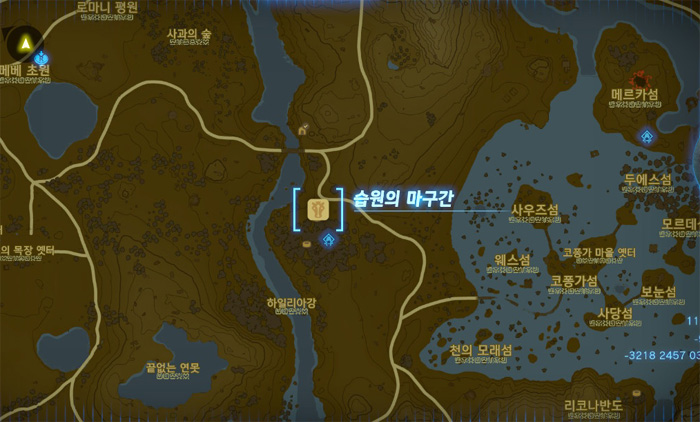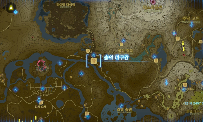 지도상에 노란색 보석 표시를 해 놓은 곳인데, 저 위치는 무서운 괴물이 있는 곳이니 그것보다 살짝 아래쪽으로 가면 된다.