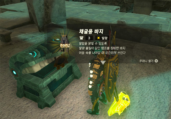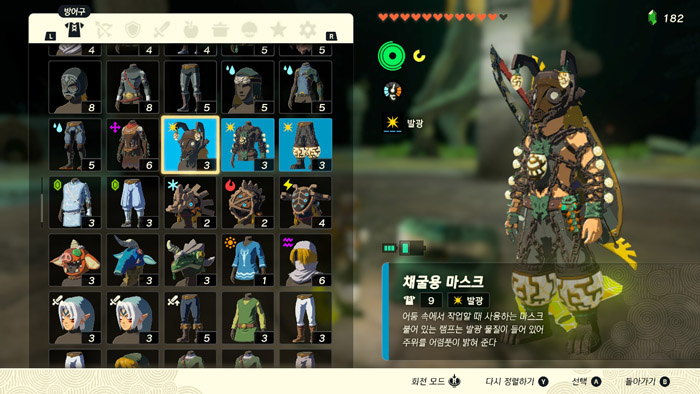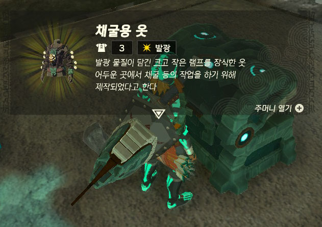: 채굴용 마스크, 채굴용 옷, 채굴용 바지 이렇게 세트인데 방어구 모두 착용하면 지저에서 링크가 돌아다니는 곳 주변이 밝아진다.