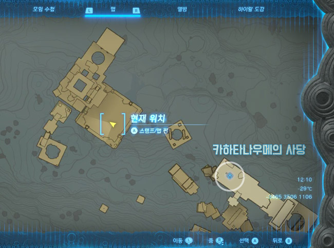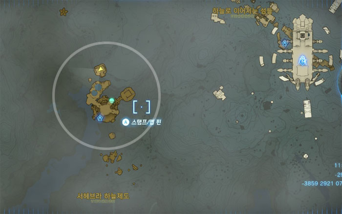 근처에 <카하타나우메의 사당>이 있는데, 노란색 표시한 하늘섬보다 사당이 더 위쪽에 있기 때문에 사당으로 워프하고 패러세일 타고 골렘 쪽으로 날아가면 된다.