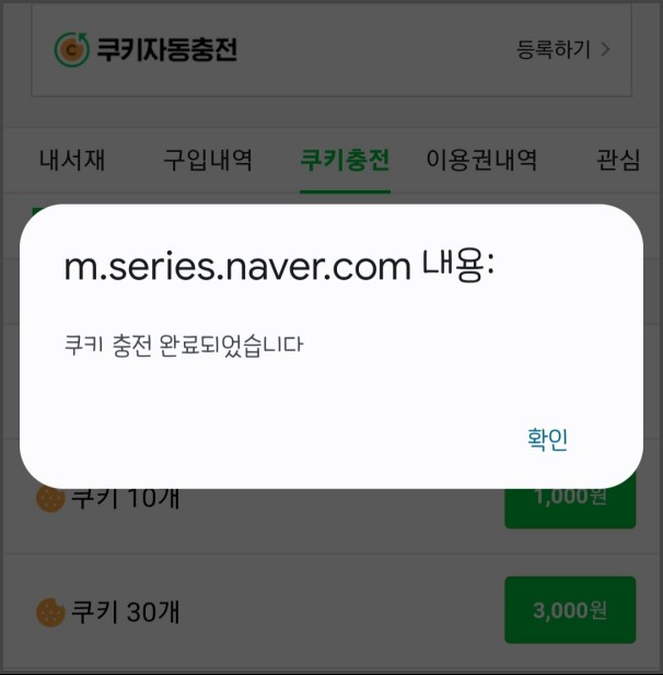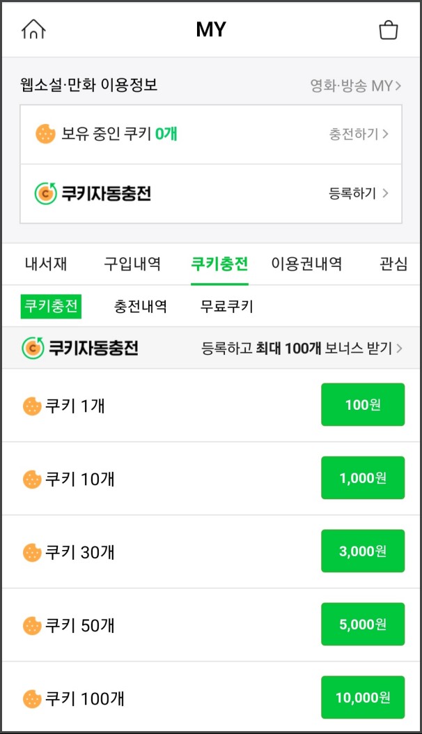 왼쪽이 웹사이트로 들어갔을 때, 쿠키 금액이고 오른쪽이 시리즈앱에서 바로 쿠키를 충전했을 때 금액이다.