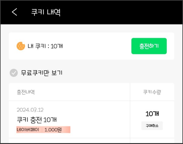 그러니 결제는 꼭 앱이 아닌 인터넷 사이트로 들어가서 결제해야 한다. 인터넷 사이트로 들어가면 쿠키 1개당 100원 그대로다.