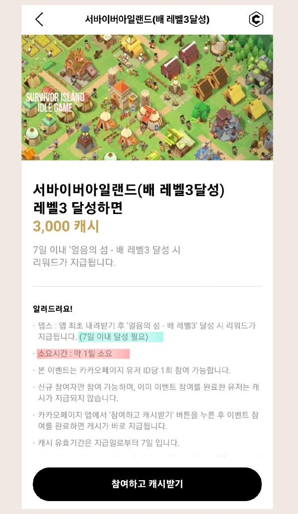 서바이버아일랜드 레벨3 달성 걸린시간(19시간) 카카오 3000캐시 지급 이벤트