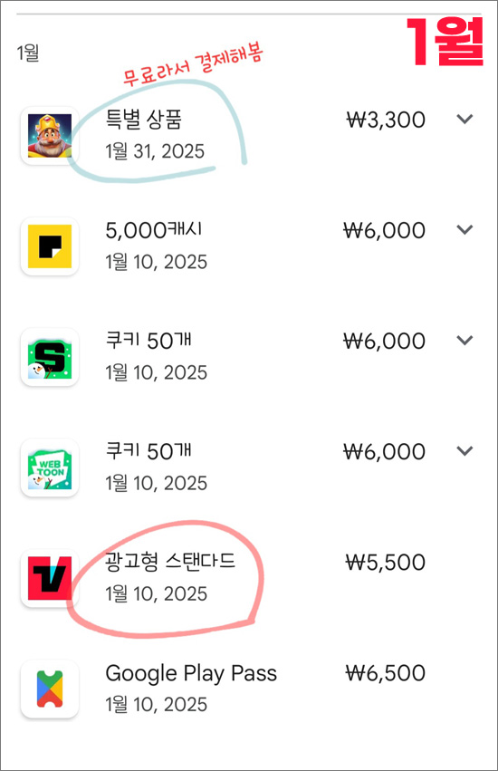 원래는 구글플레이패스 가입하면, 6500원 구독료 안에 무료혜택으로 포함되어 있던 건데, 그달의 행사 기간이 지냈는데 내가 구독취소 안 하고 그대로 사용하고 있던 것. ㅠㅠ